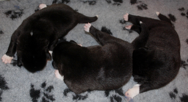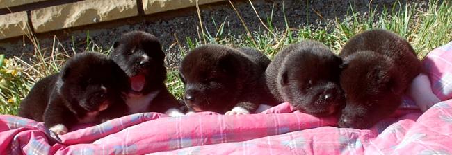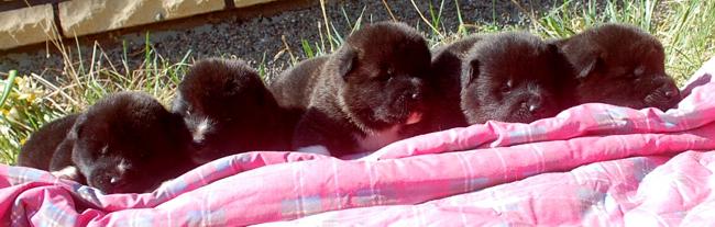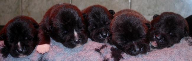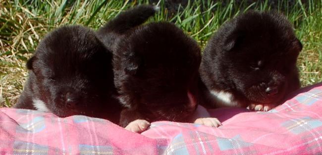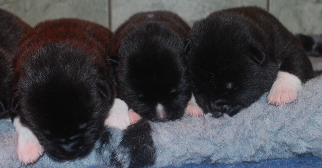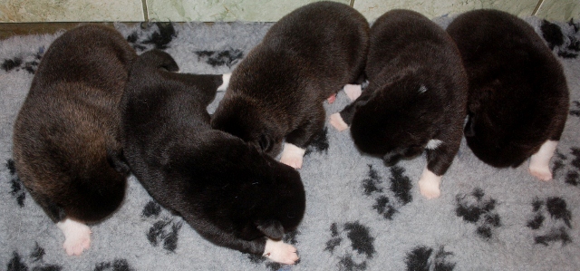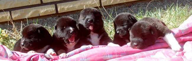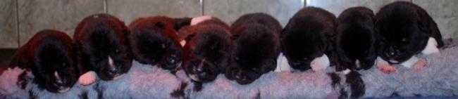 13.4.12 was born Pamela's (Finigan Ak-Tan Catingo to Midian's) and Akyto's (NL Ch Kevin's Dream Akyoto) puppies. There are 5 males and 3 females, all puppies are dark colored with white marks.